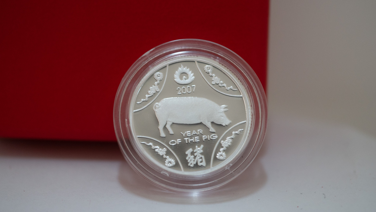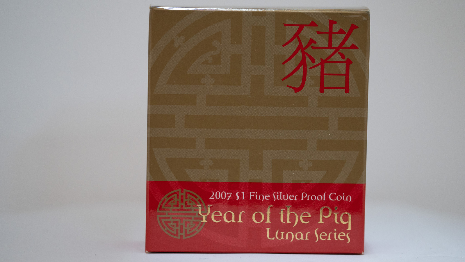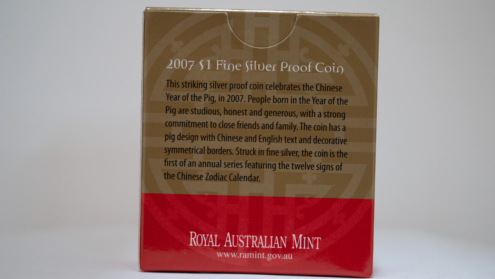 This legal tender fine silver proof coin created by the Royal Australian Mint celebrates the Chinese Lunar Year of the Pig in 2007.