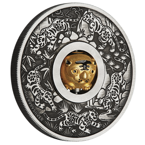 The Perth Mint will release no more than 3,000 of the Year of the Tiger Rotating Charm 2022 1oz Silver Antiqued Coin.