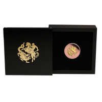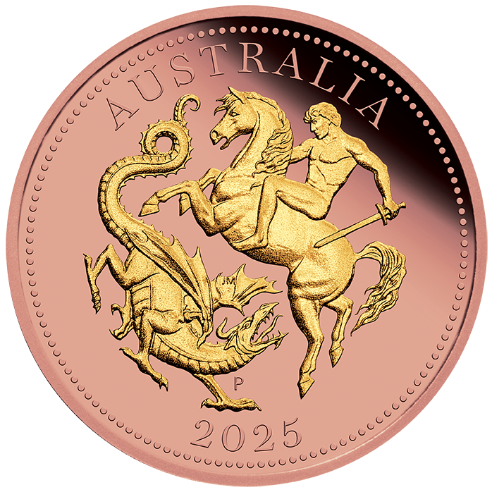 This modern collectable re-imagines the famous design. The new work portrays a naked warrior on horseback brandishing a sword above a dragon. The image appears within a decorative circle of raised dots, together with the inscription ‘AUSTRALIA’, ‘2025’, and The Perth Mint’s ‘P’ mintmark. Each of these elements is gilded in stunning 22-carat pink gold.