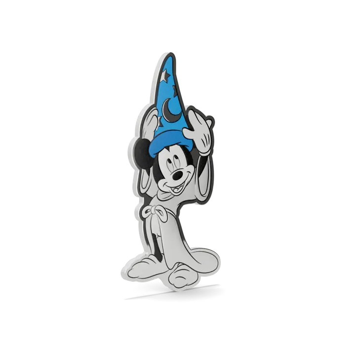 Disney’s Sorcerer’s Apprentice Mickey Framed by a mirror finish edge, Sorcerer’s Apprentice Mickey is captured in a shining mirror finish with vintage black and white layering, worthy of the 1940s era. His hat bursts in a bright blue, and is covered with a shining moon and stars.