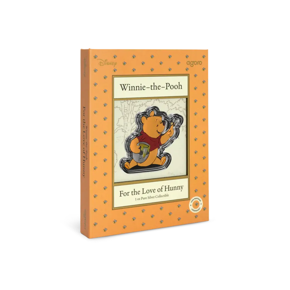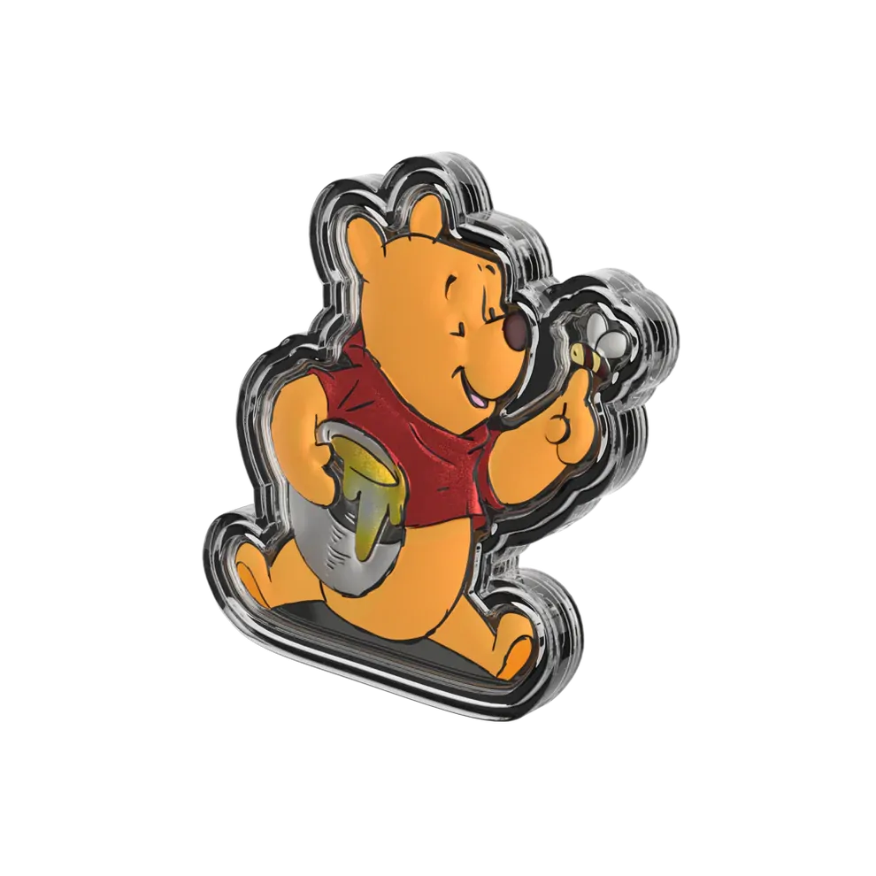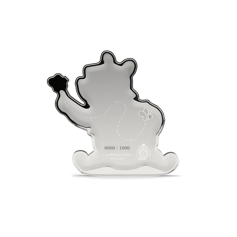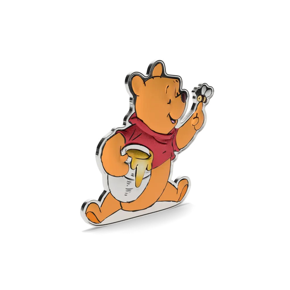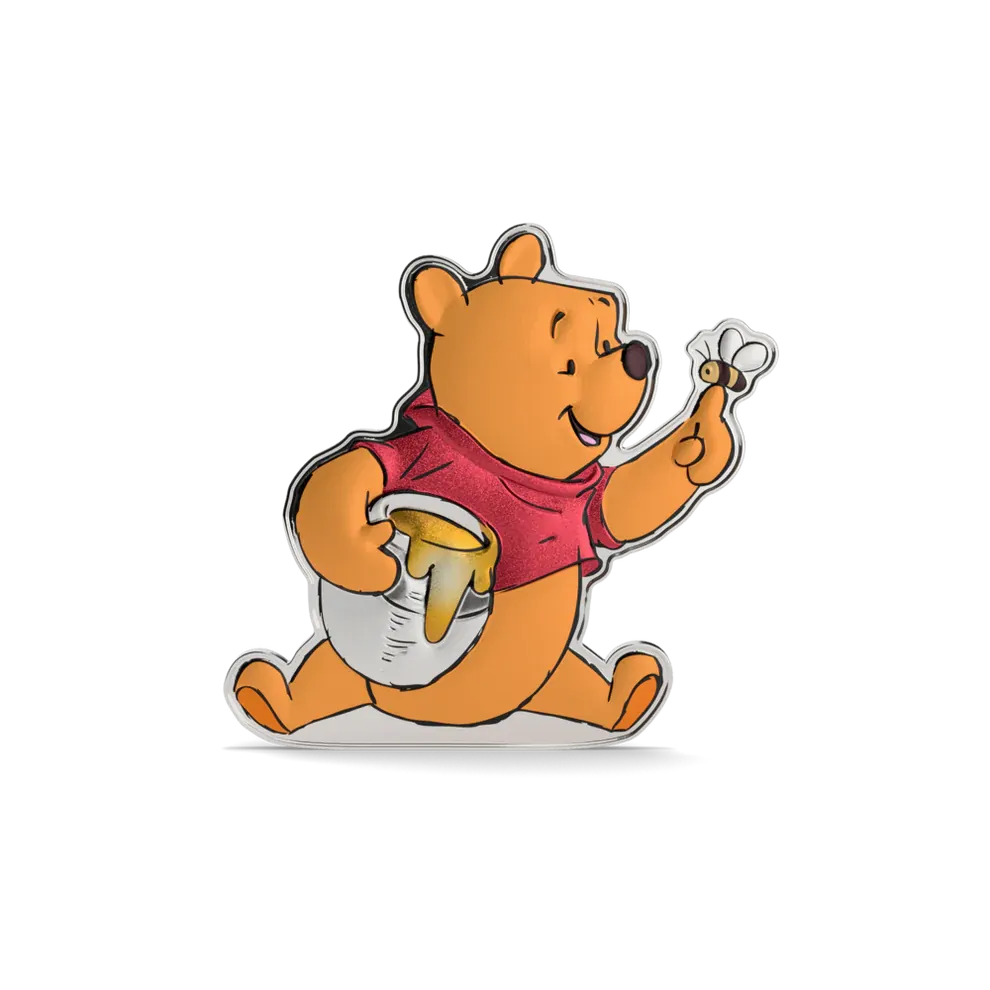 This officially licensed 1oz silver collectible is shaped and colored to bring Pooh to life in charming detail, complete with a bee perched on his finger and his beloved honey pot tucked under his arm. Can you spot the metallic color printing on his shirt and the honey pot? A true keepsake, crafted in 999 pure silver.