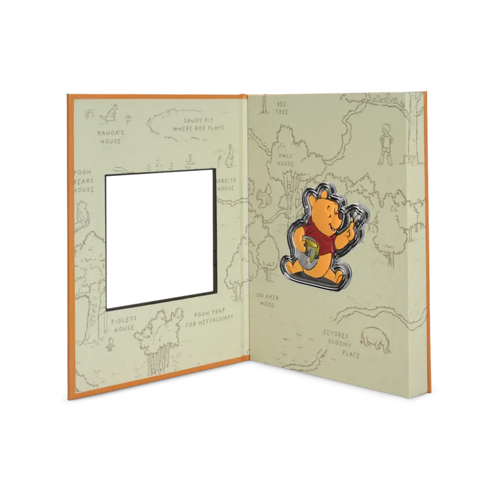 The coloured coin is set in a package resembling a book replicating one of the classics originally by A.A. Milne classics