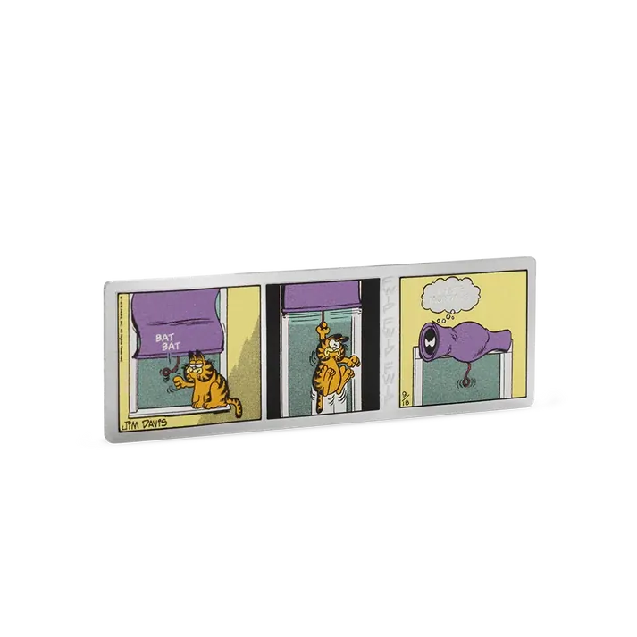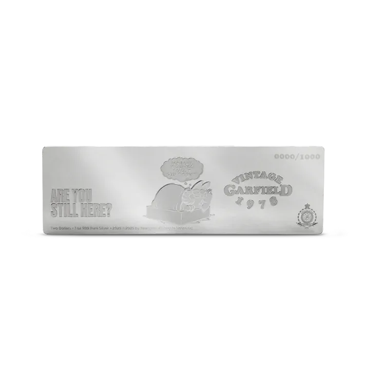 On the front is the three-panel strip from 1978 featuring Garfield’s “I hate Mondays” moment. Flip the collectible to find Garfield in heavy frosting, smirking as he thinks “Some call it laziness, I call it deep thought.” Alongside him, the words “Are you still here?” gleam against a stunning mirror finish.