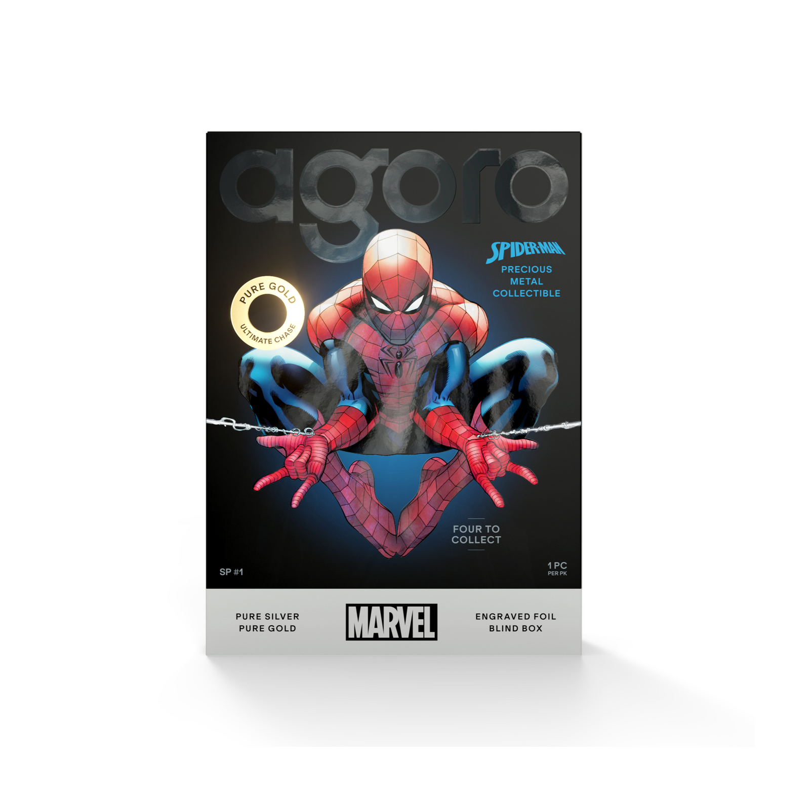 Tier 3 features Spider Man fully engraved on silver. Tier 4 features the ultimate chase, Spider Man fully engraved on 999 pure gold. Tier 1 odds are 69% odds per box, Tier 2 are 20% odds per box, Tier 3 are 10% odds per box, and Tier 4 has 1% odds per box.