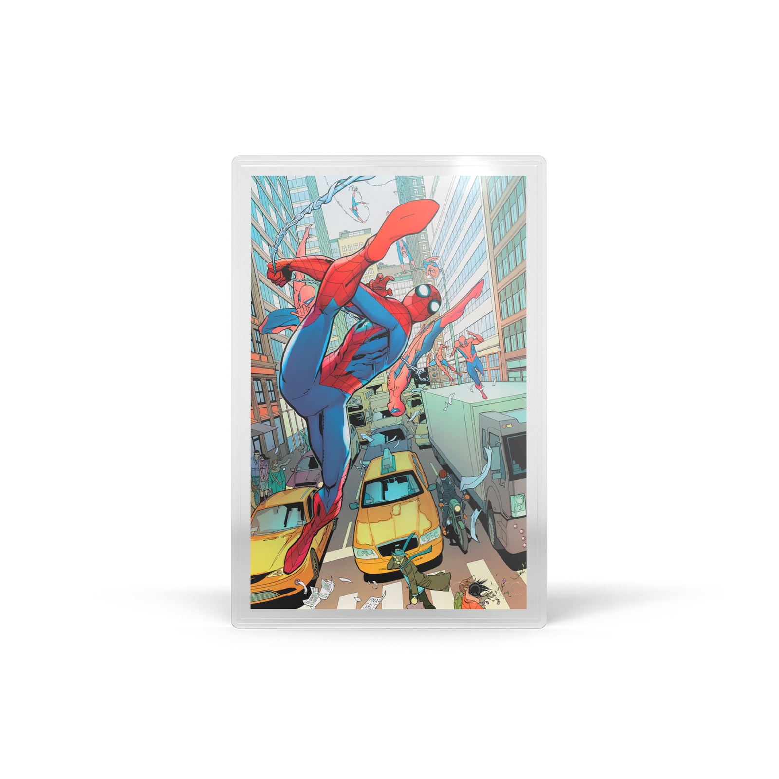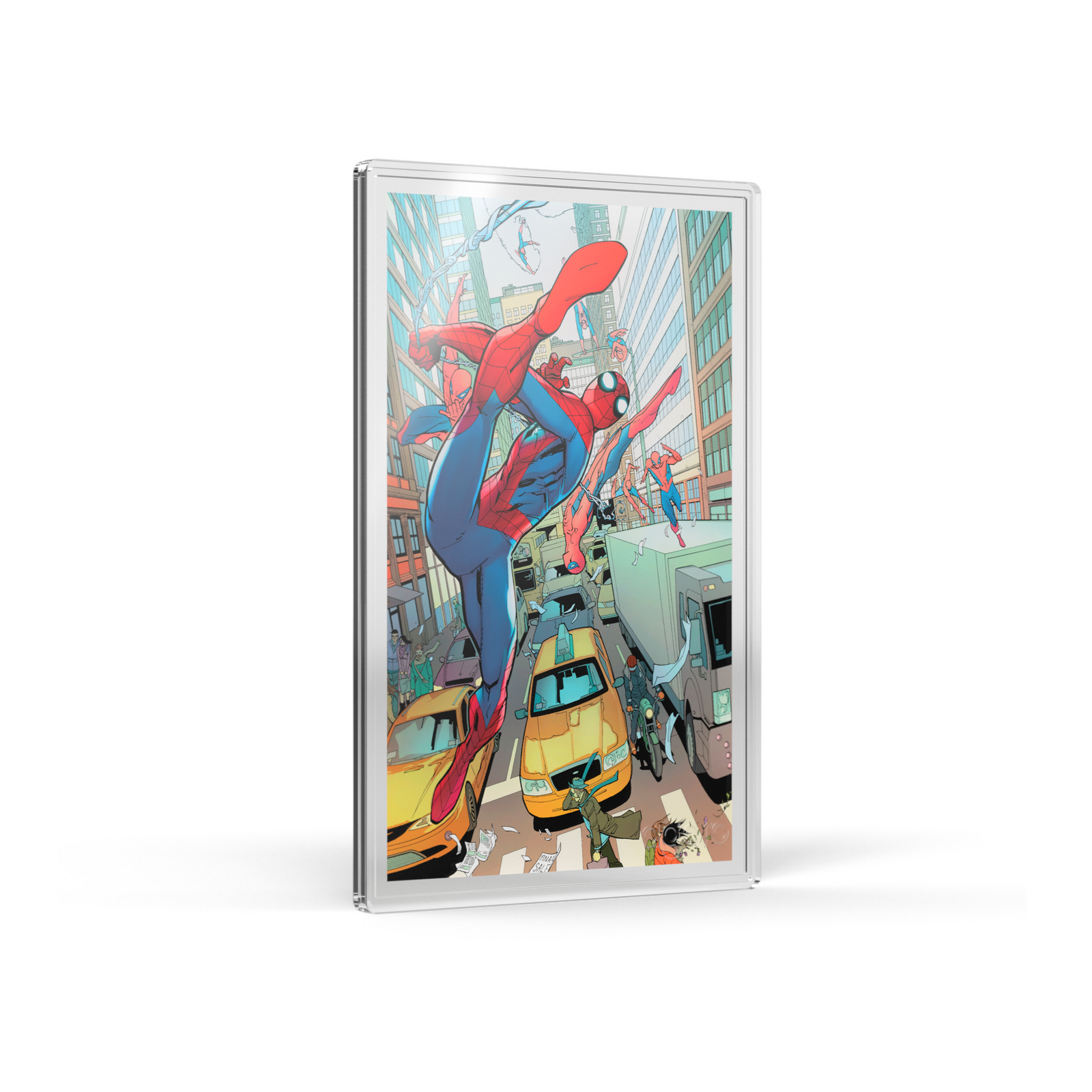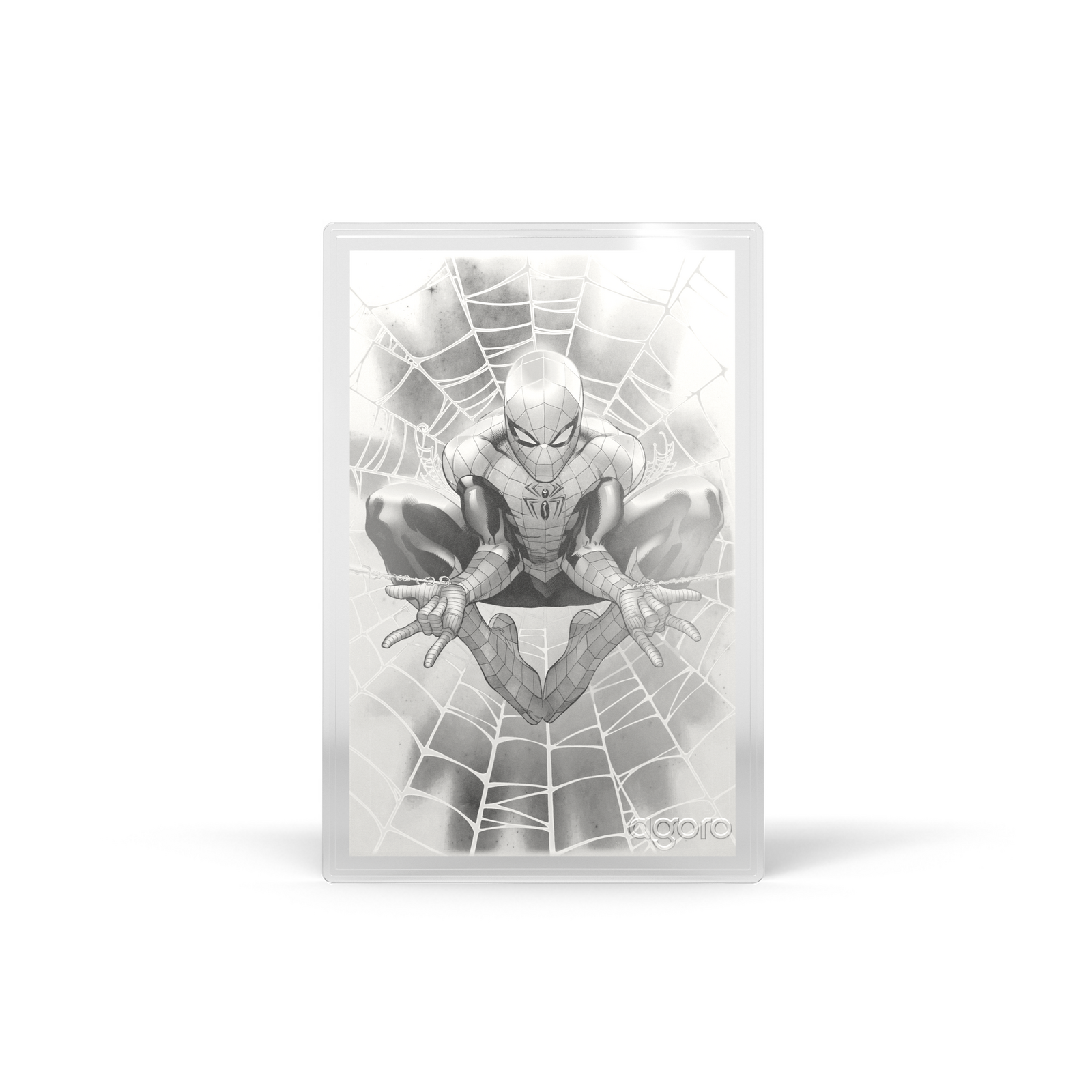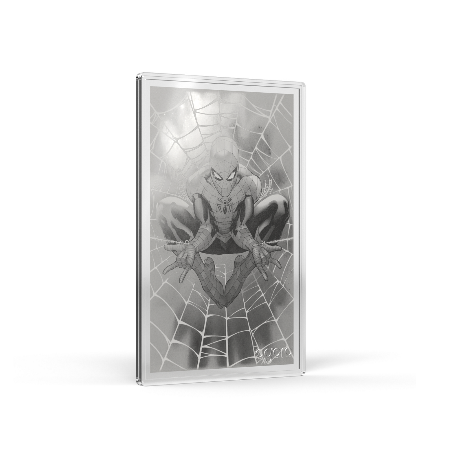 Depictions of Spider Man engraved on silver of gold foil.