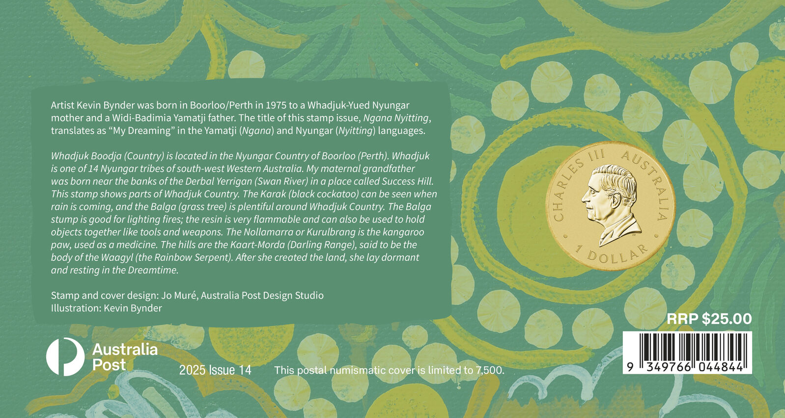 The title of this stamp issue, Ngana Nyitting, translates as “My Dreaming” in the Yamatji (Ngana) and Nyungar (Nyitting) languages. Artist Kevin Bynder was born in Boorloo / Perth in 1975 to a Whadjuk-Yued Nyungar mother and a Widi-Badimia Yamatji father.