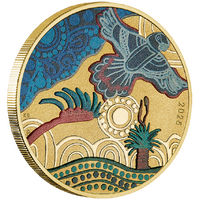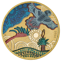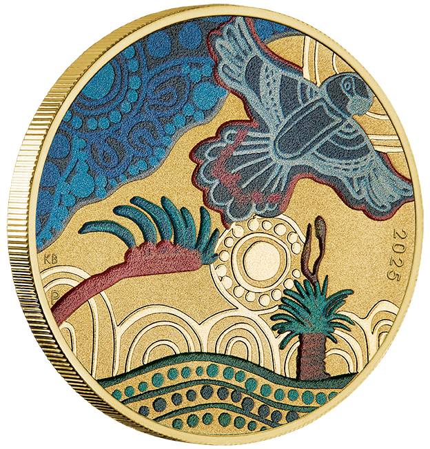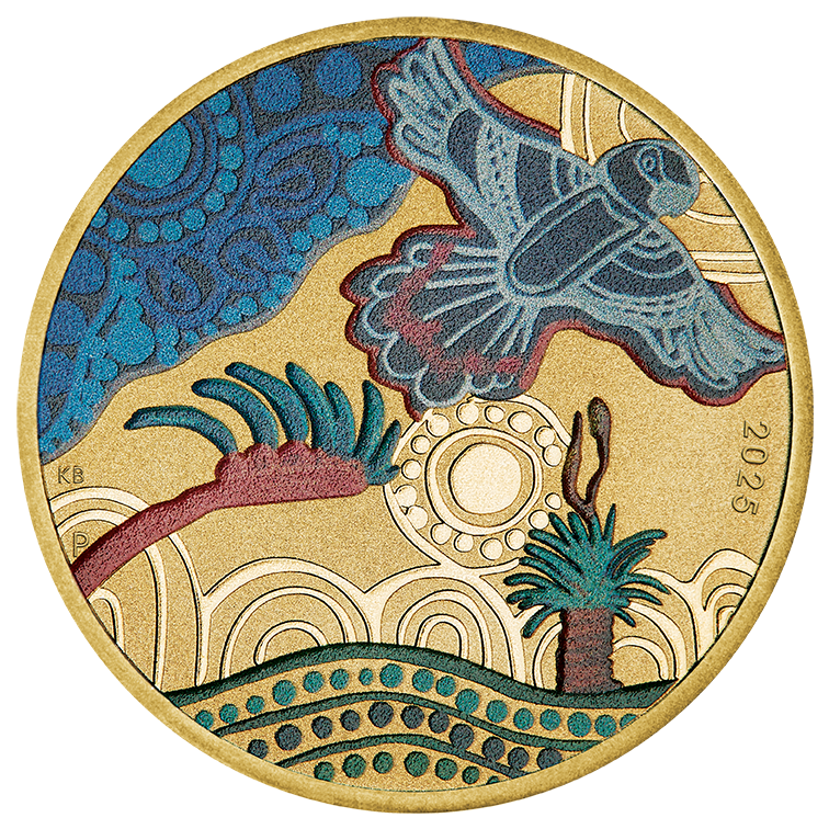 The coin’s reverse presents an illustration of Karak (black cockatoo), Kurulbrang (kangaroo paw), Balga (grass tree) and the Kaart-Morda (Darling Range). As well as the artist’s initials and the year date, the reverse also incorporates The Perth Mint’s ‘P’ mintmark.