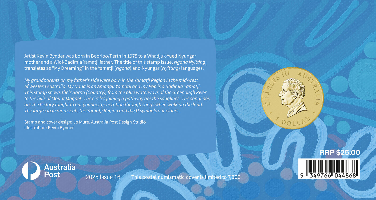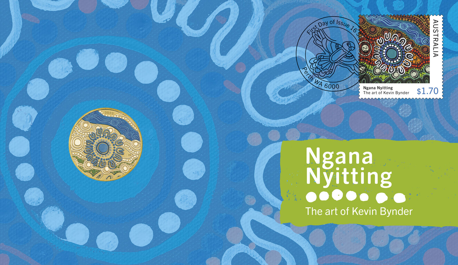 The title of this stamp issue, Ngana Nyitting, translates as “My Dreaming” in the Yamatji (Ngana) and Nyungar (Nyitting) languages.