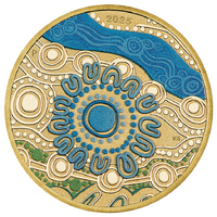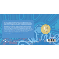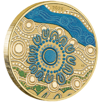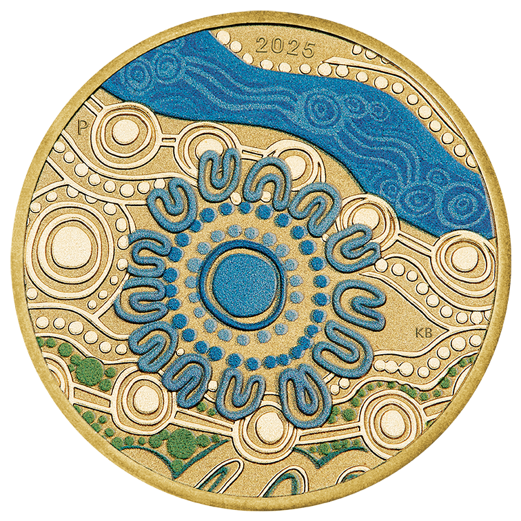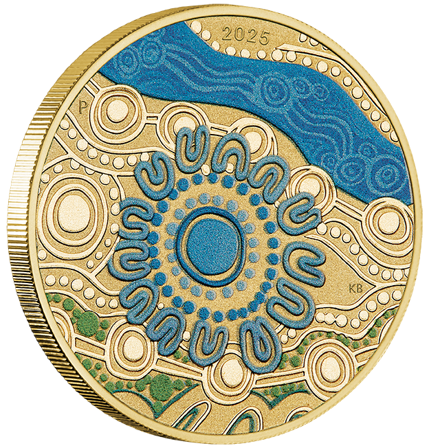 The coin’s reverse presents an illustration of the blue waterways of the Greenough River to the hills of Mount Magnet. The large circle represents the Yamatji Region surrounded by U symbols representing the elders. As well as the artist’s initials and the year date, the reverse also incorporates The Perth Mint’s ‘P’ mintmark.