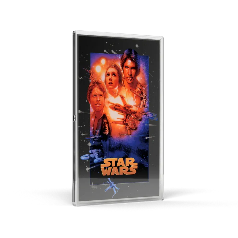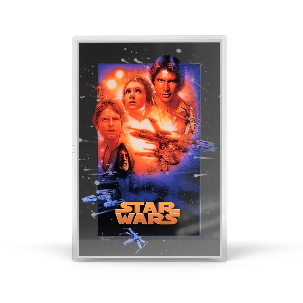 The first release in our Star Wars™ Original Trilogy Poster series captures the legendary 1977 film in 1oz of 999 pure silver foil. Later subtitled Star Wars: A New Hope™, this defining moment in cinema history is reimagined in striking detail.