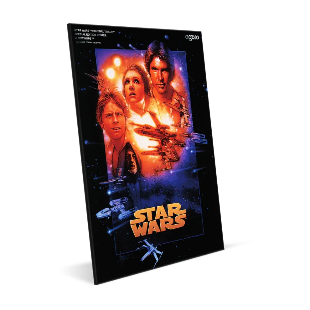 The alternate poster art bursts with retro energy, Han Solo, Princess Leia, and a young Luke Skywalker stand ready, while starships cut across the background in semi-transparent print. Framed against a mirror-polished galaxy with frosted stars, it’s a tribute worthy of the saga’s beginning.