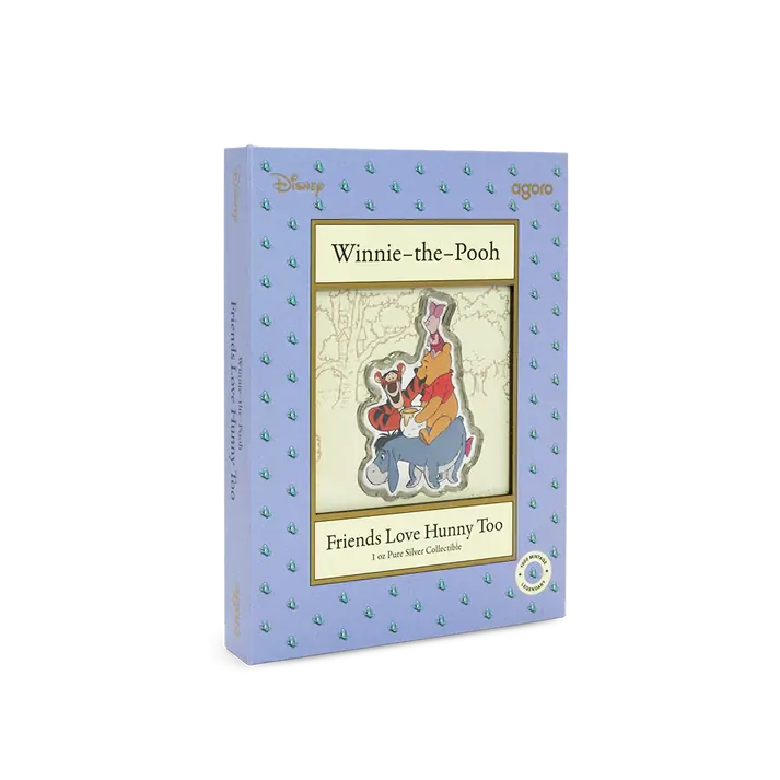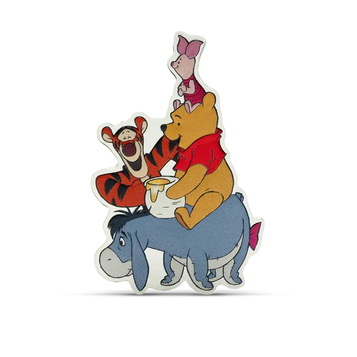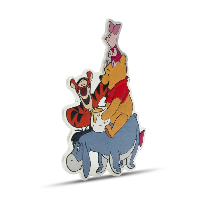 All of Disney’s Winnie the Pooh lovable charm is captured in 1oz of 999 pure silver. This shaped and colored collectible brings Winnie the Pooh and friends riding happily atop Eeyore, with Piglet perched on Pooh’s shoulders as they journey through the Hundred Acre Wood.