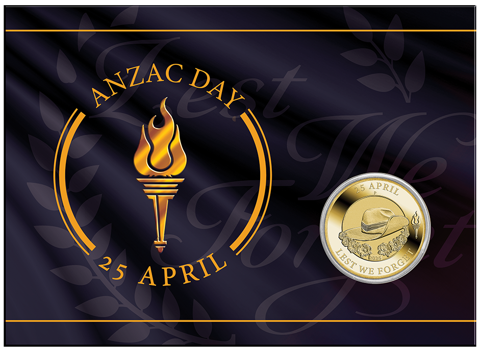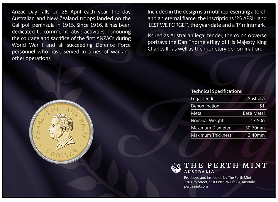 Included in the design is a motif representing a torch and an eternal flame, the inscriptions ‘25 APRIL’ and ‘LEST WE FORGET’, the year-date and a ‘P’ mintmark.