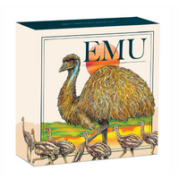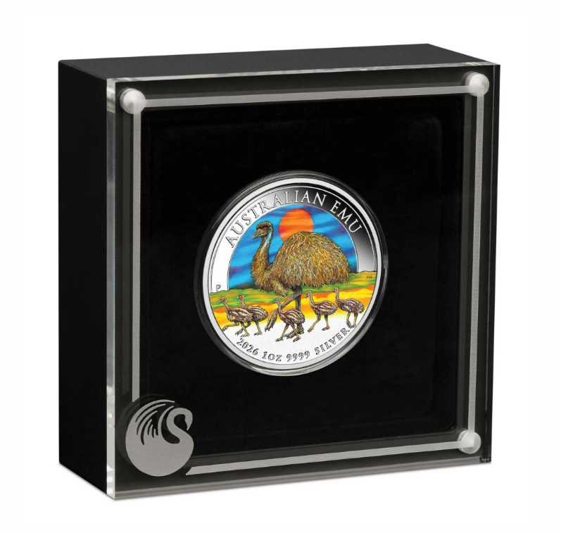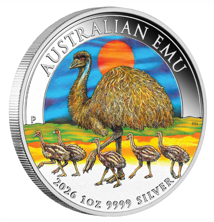 The coin’s coloured reverse portrays an adult emu walking alongside five young chicks. The background includes a representation of a desert landscape with a blue sky and orange sun. The inscription ‘AUSTRALIAN EMU’ appears within the design, which also includes the coin’s weight, purity, 2026 year-date, and The Perth Mint’s ‘P’ mintmark.