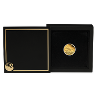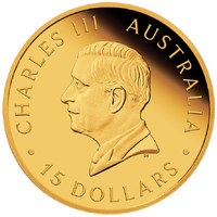 The coin’s reverse portrays two kangaroos leaping across the water. The background features water ripples and splashes with a mountain landscape in the distance. A privy mark with the number 40, pays tribute to the 40th anniversary of the Australian Nugget, the first official Australian legal tender gold coin series.