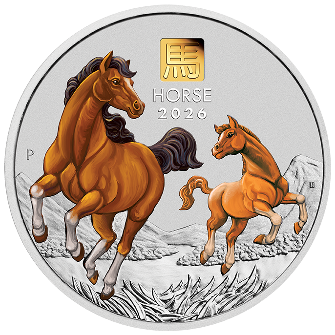 The coin’s reverse portrays a coloured representation of a majestic mare alongside her young foal, both depicted with elegant manes in a striking galloping stance. The background includes towering mountains and the lush serenity of grasslands. Also included in the design is a 1-gram pure gold privy insert portraying the Chinese character for ‘Horse’, the inscription ‘HORSE 2026’, and The Perth Mint’s ‘P’ mintmark.