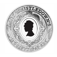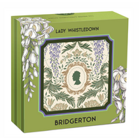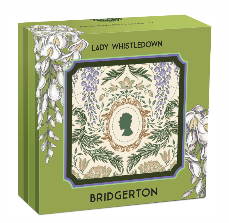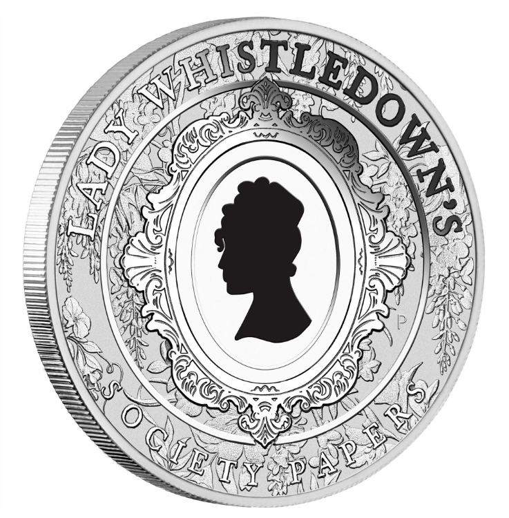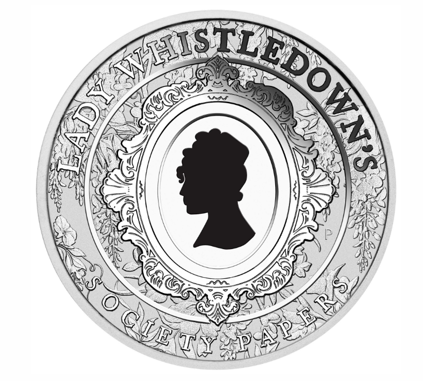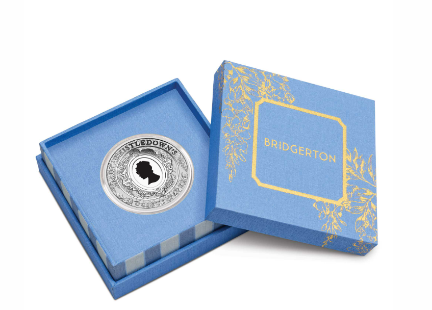 The coin’s reverse portrays an illustrated portrait of Lady Whistledown, framed by an ornate Regency-style border and encircled with the inscription “LADY WHISTLEDOWN’S SOCIETY PAPERS”. The design also includes The Perth Mint’s ‘P’ mintmark.