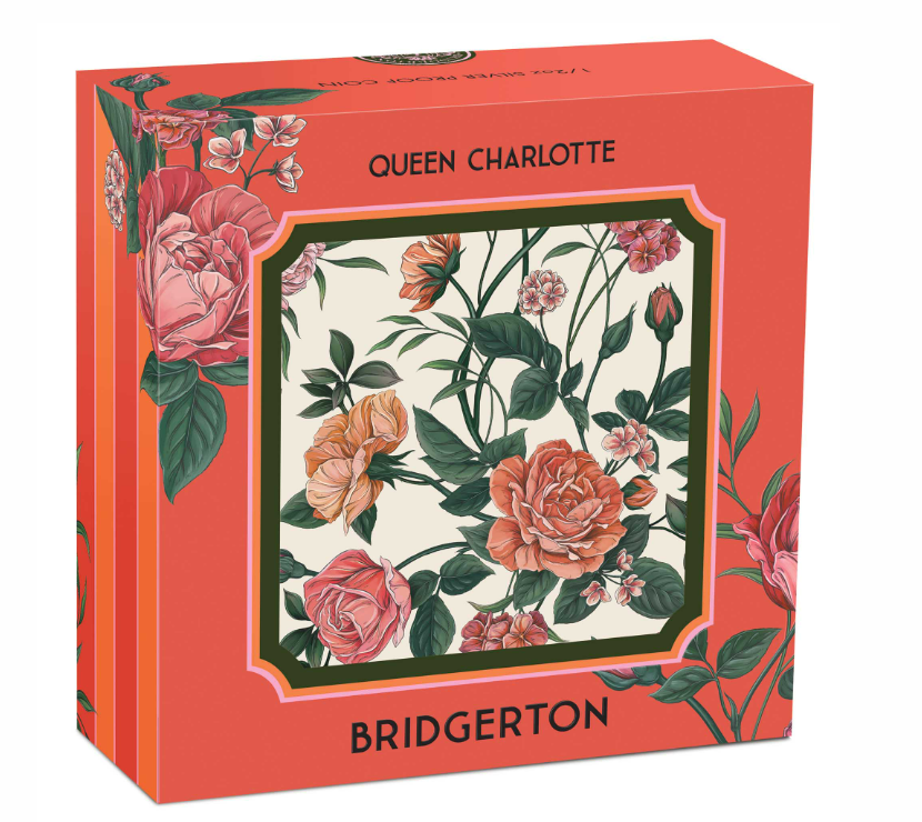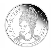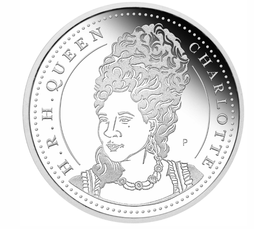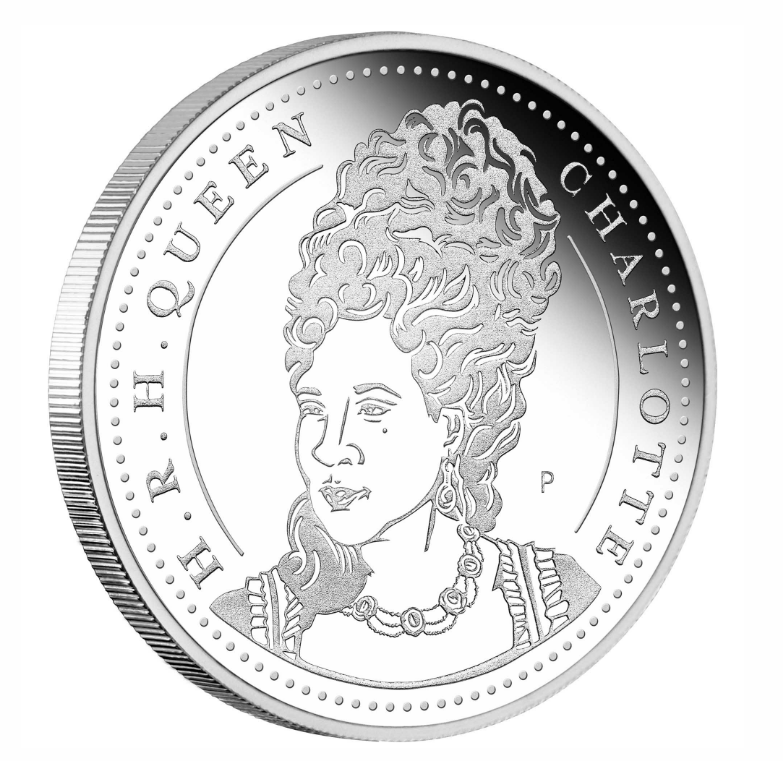 The coin portrays an illustrated portrait of Queen Charlotte, accompanied by the inscription “H.R.H QUEEN CHARLOTTE”, encircled by a ring of stylised dots. The design is reminiscent of coinage from the Regency-era and includes The Perth Mint’s ‘P’ mintmark.