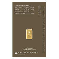 The back of the bar is stamped with The Perth Mint's London Bullion Market Association registered mark, a stylised swan symbolising our 126-year-old reputation for quality. The bar’s weight and fineness appear on a patterned background.