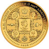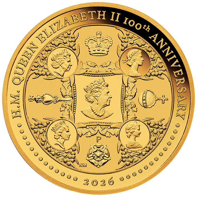 The background features Australia’s national floral emblem, the golden wattle, symbolising the nation’s connection to the Commonwealth. Arranged clockwise from the top, are motifs of St Edward’s Crown, the Sovereign’s Orb, Tudor rose, and Sovereign’s Sceptre—each signifying key elements of royal tradition and authority. Surrounding the design is the inscription “H.M. QUEEN ELIZABETH II 100th ANNIVERSARY”, accompanied by stylised dots, the 2026 year-date, and The Perth Mint’s ‘P’ mintmark.