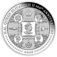 Surrounding the design is the inscription “H.M. QUEEN ELIZABETH II 100th ANNIVERSARY”, accompanied by stylised dots, the 2026 year-date, and The Perth Mint’s ‘P’ mintmark.
