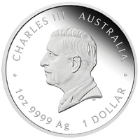 The coin’s obverse depicts the Dan Thorne effigy of His Majesty King Charles III, along with the coin’s weight, fineness and monetary denomination.