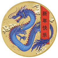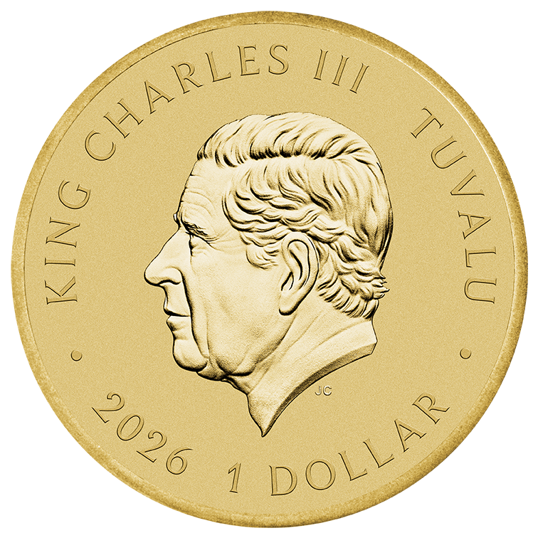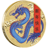 The coin’s reverse presents an illustration of a coloured dragon dancing among celestial clouds. As well as the Chinese scroll with Chinese characters “新年快乐”, meaning Happy New Year, the reverse also incorporates The Perth Mint’s ‘P’ mintmark.