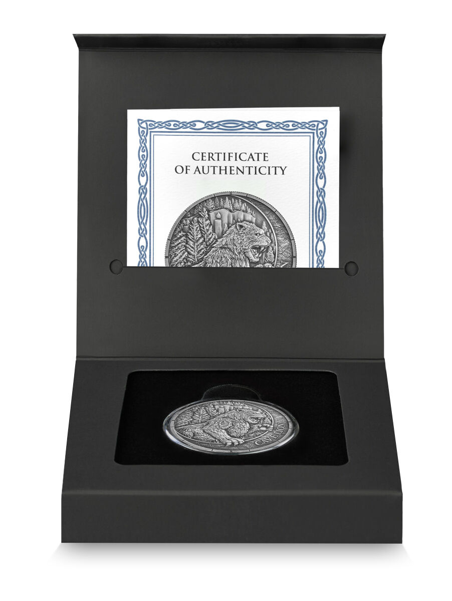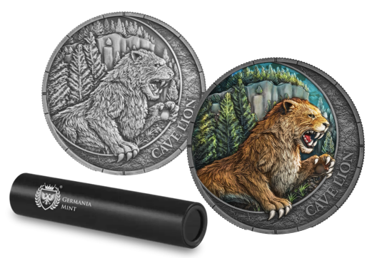 2026 Megafauna Cave Lion 1oz Silver Antiqued finish, Black light Colours Germania Mint Coin Box and COA