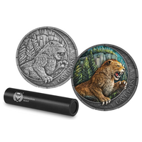 On the obverse, the Cave Lion is depicted in full readiness, set against a backdrop of mountains and ancient forests. Its powerful body, sharp fangs, and claws reflect the strength and dominance of this apex predator.