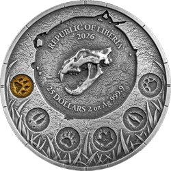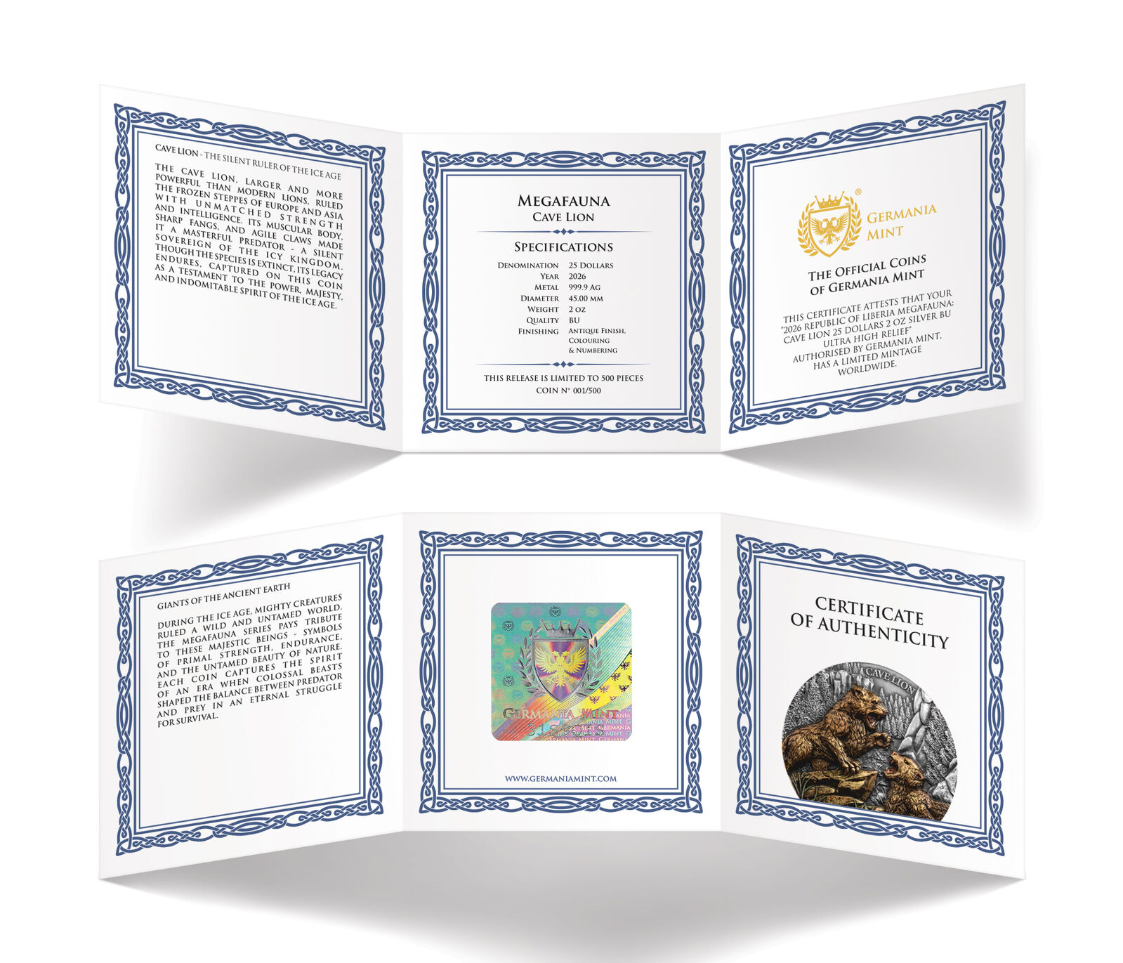 Discover the majesty of the Ice Age with the new Megafauna series from Germania Mint. Leading the collection is the cave lion, an ancient giant that once ruled the frozen steppes of Europe and Asia. The 2026 Republic of Liberia Megafauna: Cave Lion 25 Dollars 2 oz Silver BU Ultra High Relief coin celebrates the power, grace, and survival instincts of this legendary predator.