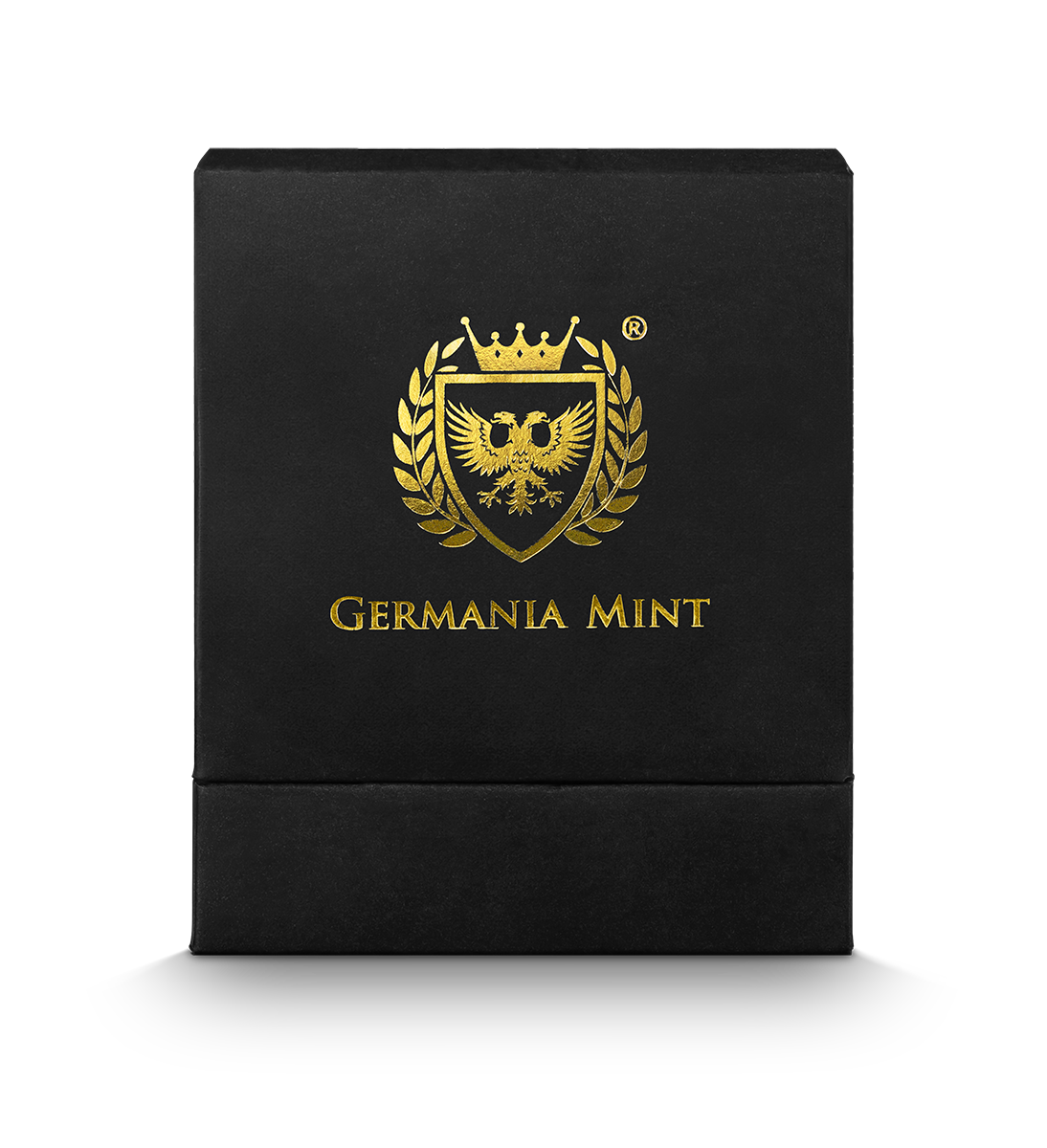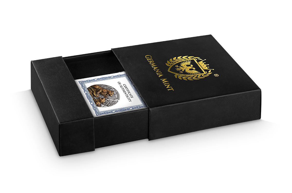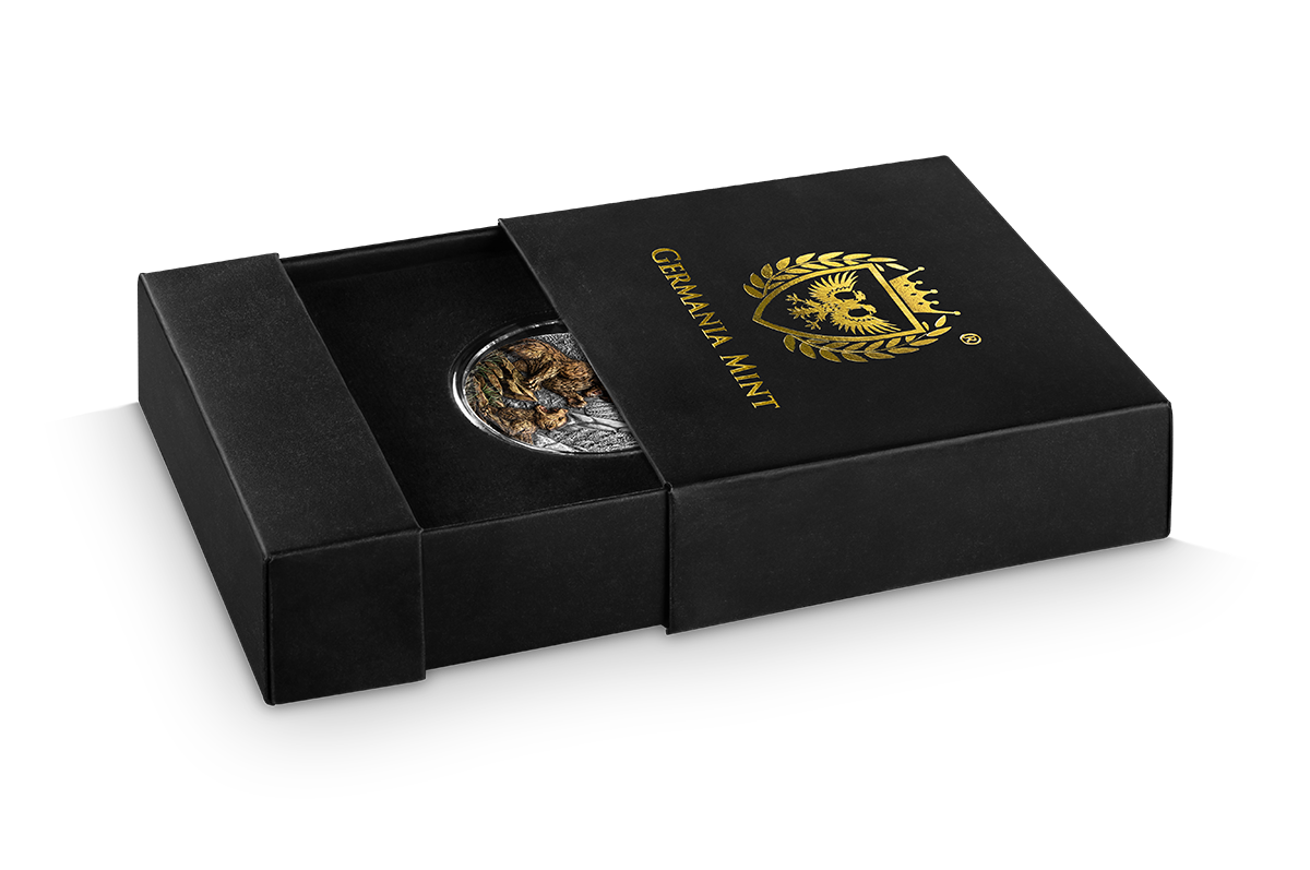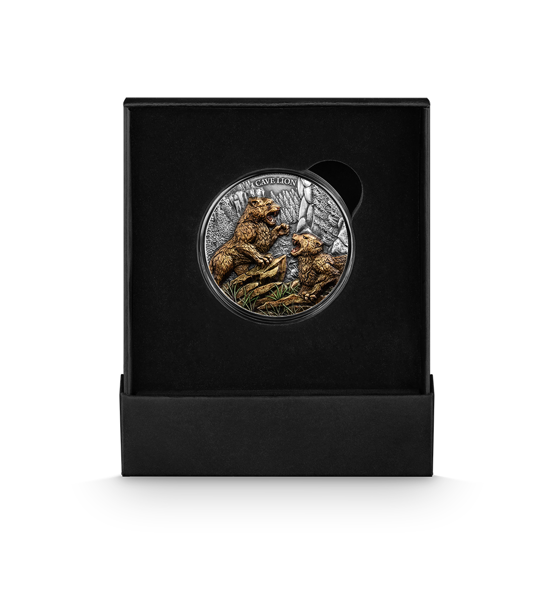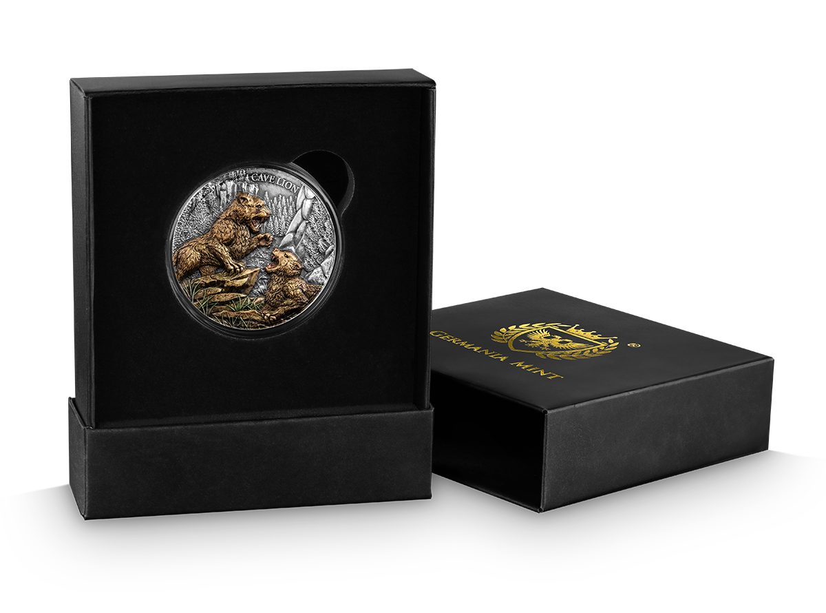 On the obverse, the cave lion comes to life in full attack readiness, set against mountains and ancient forests, with tense muscles and prominent claws –captured in a moment of hunting intensity, facing its prey head-on.