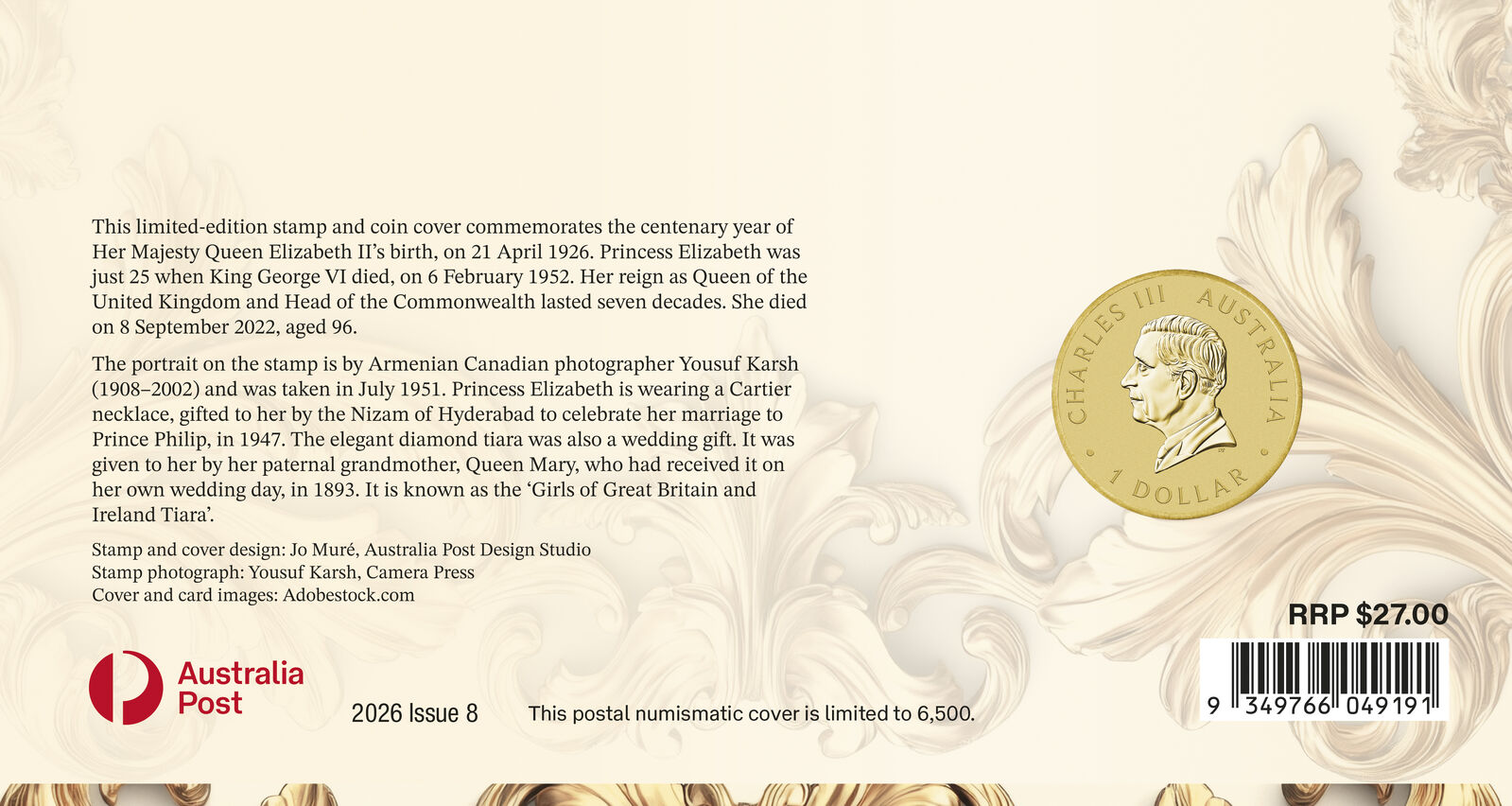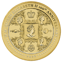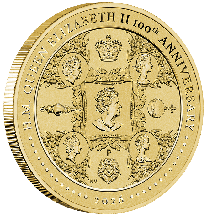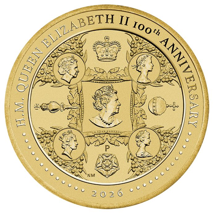 The coin’s reverse includes five effigies of Queen Elizabeth II, each featured on coins produced by The Perth Mint, representing distinct periods of her historic reign. At the centre is the most recent effigy of Queen Elizabeth II designed by Jody Clark (2019), elegantly framed in an ornate design. Surrounding it are four earlier effigies: Ian Rank-Broadley (1998) at the top left, Raphael Maklouf (1985) at the bottom left, Arnold Machin (1966) at the bottom right, and Mary Gillick (1953) at the top right. Together, these portraits reflect the evolving image of the monarch across seven decades of her reign. The background features Australia’s national floral emblem, the golden wattle, symbolising the nation’s connection to the Commonwealth. Arranged clockwise from the top, are the Sovereign’s Imperial State Crown, Orb, Tudor Rose, and Sceptre—each symbolising key elements of royal tradition and authority. Surrounding the design is the inscription “H.M. QUEEN ELIZABETH II 100th ANNIVERSARY”, accompanied by stylised dots, the 2026 year-date, and The Perth Mint’s ‘P’ mintmark.