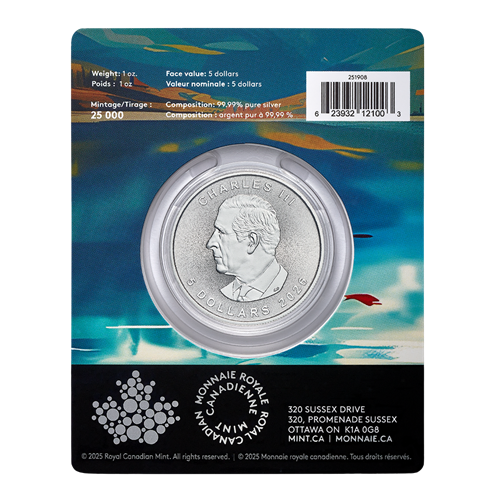 Featuring the effigy of His Majesty King Charles III, the 2025 Treasured Silver Maple Leaf bullion coin makes it easy to give or collect 99.99% pure silver—a lasting treasure that is both precious and pure.