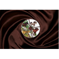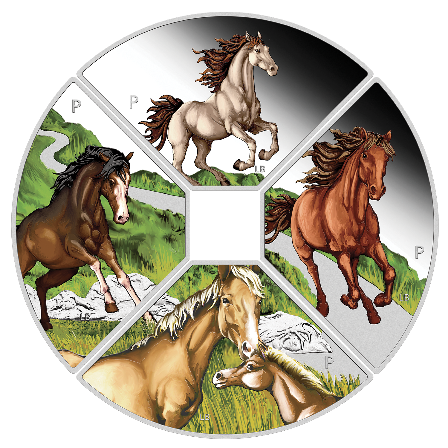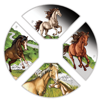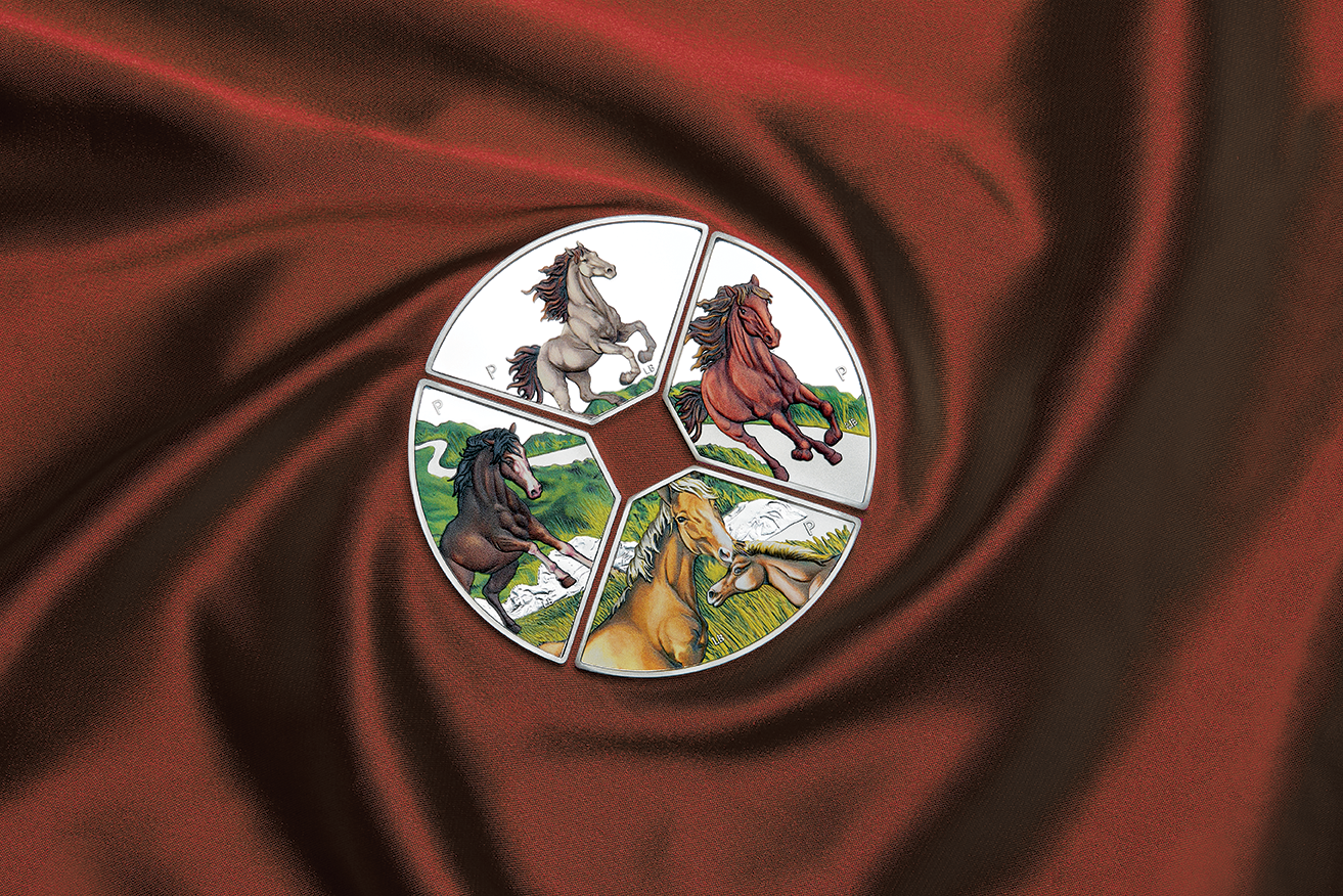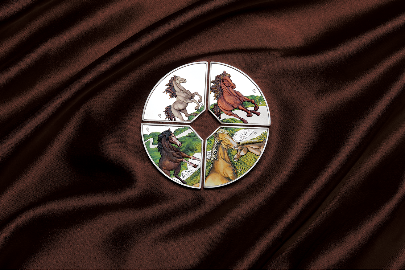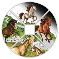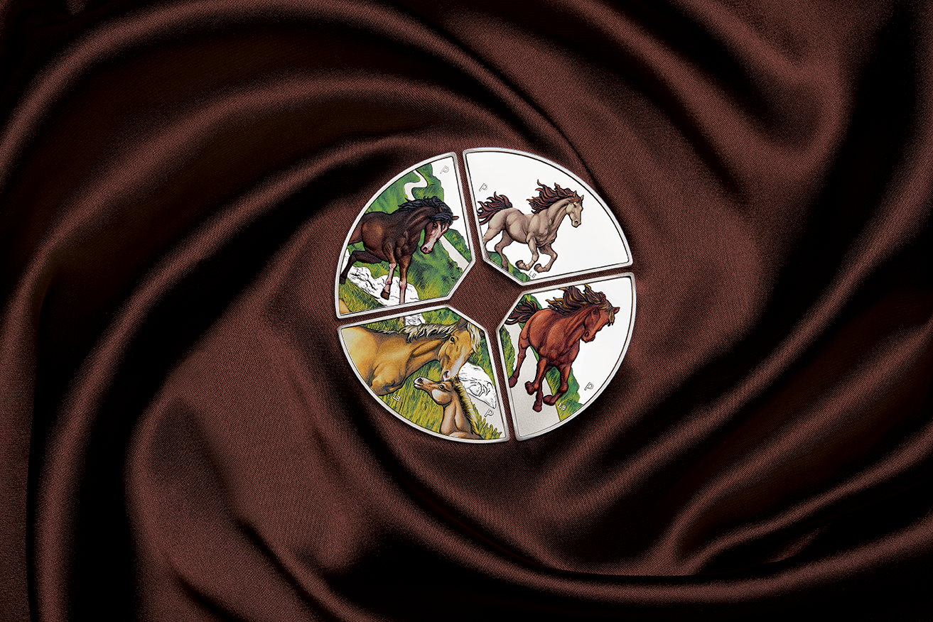 There are four different one ounce quadrants that fit together to make a circular coin with a square in the centre. Each quadrant depicts spectacular coloured horses.